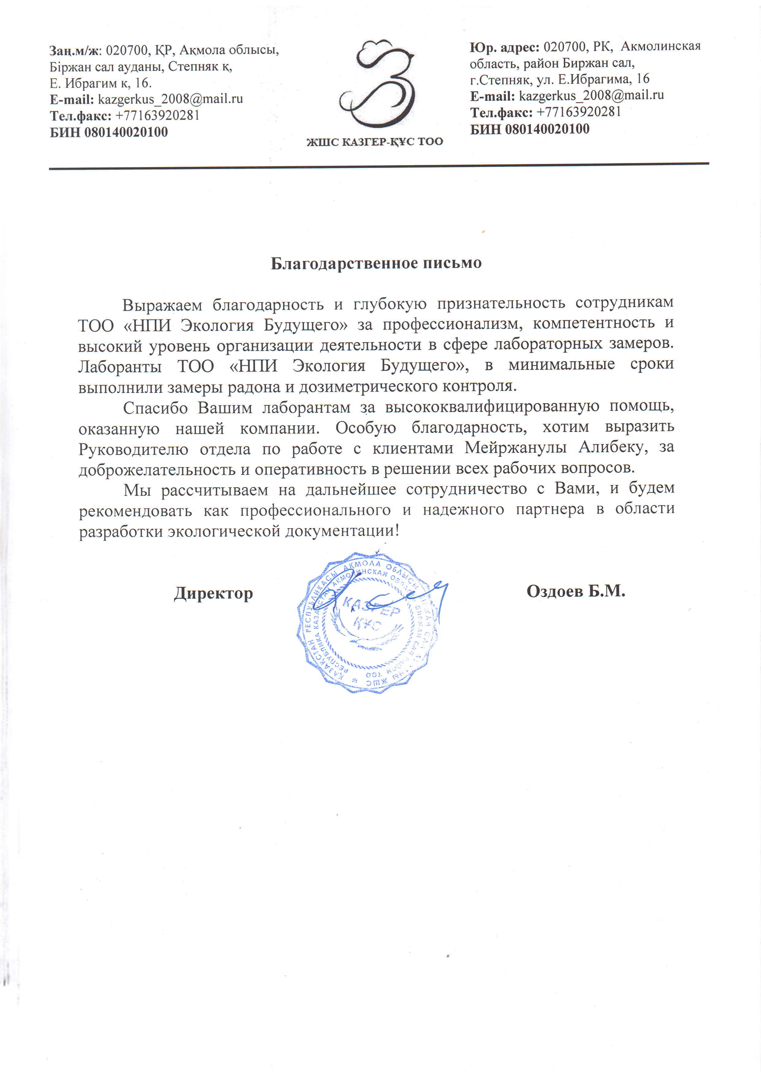 Выражаем благодарность и глубокую признательность сотрудникам ТОО «НПИ Экология Будущего» за профессионализм, компетентность и высокий уровень организации деятельности в сфере лабораторных замеров. Лаборанты ТОО «НПИ Экология Будущего», в минимальные сроки выполнили замеры радона и дозиметрического контроля.