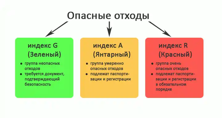В зависимости от представляемой угрозы окружающей среде все отходы делятся на классы от неопасных до очень опасных. Каждый класс обозначается своим индексом. Согласно экологическим требованиям выделяют следующие типы отходов: