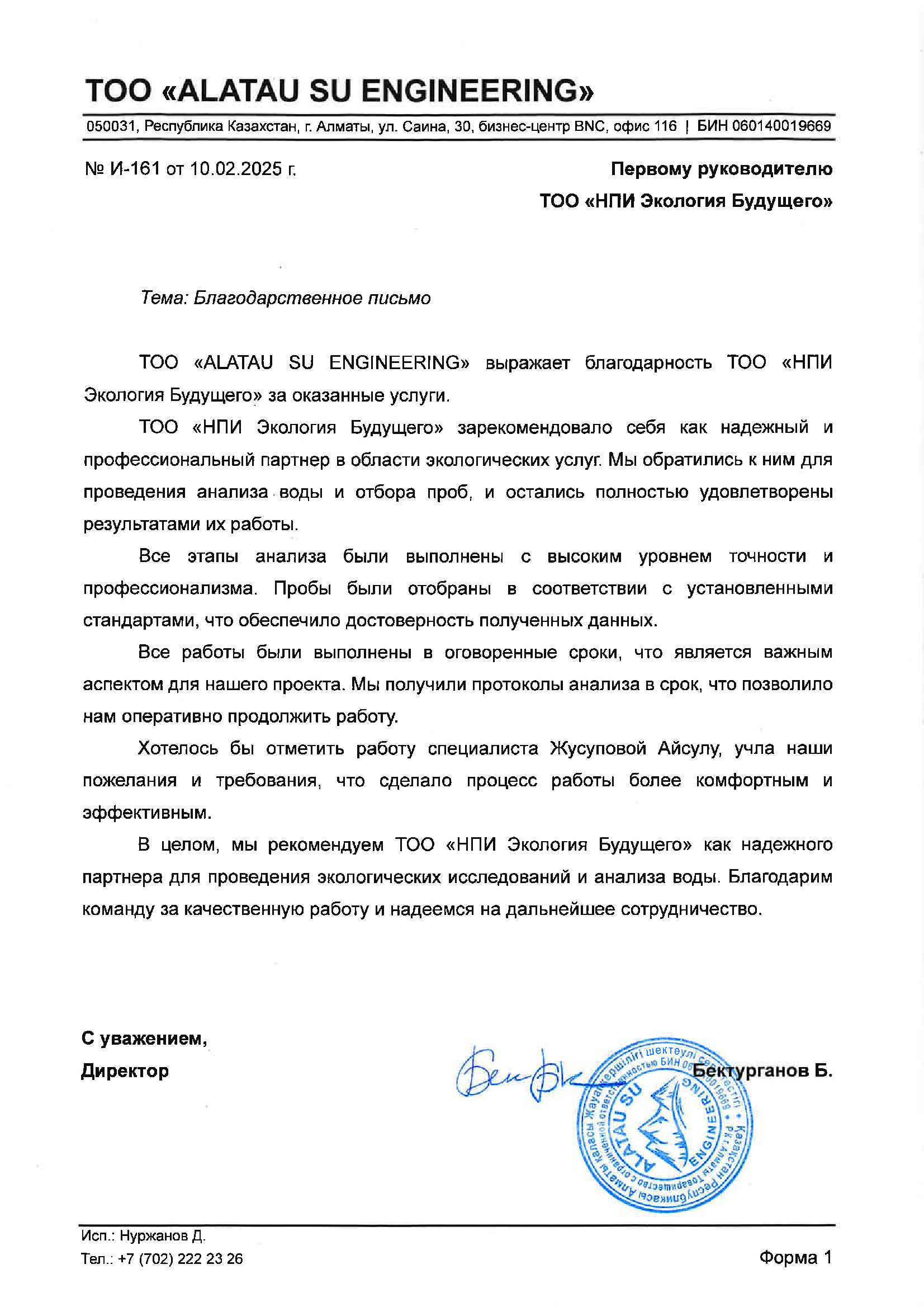 ТОО ALATAU SU ENGINEERING выражает благодарность ТОО «НПИ Экология Будущего» за оказанные услуги. ТОО «НПИ Экология Будущего» зарекомендовало себя как надежный и профессиональный партнер в области экологических услуг. Мы обратились к ним для проведения анализа воды и отбора проб, и остались полностью удовлетворены результатами их работы. Все этапы анализа были выполнены с высоким уровнем точности и профессионализма.